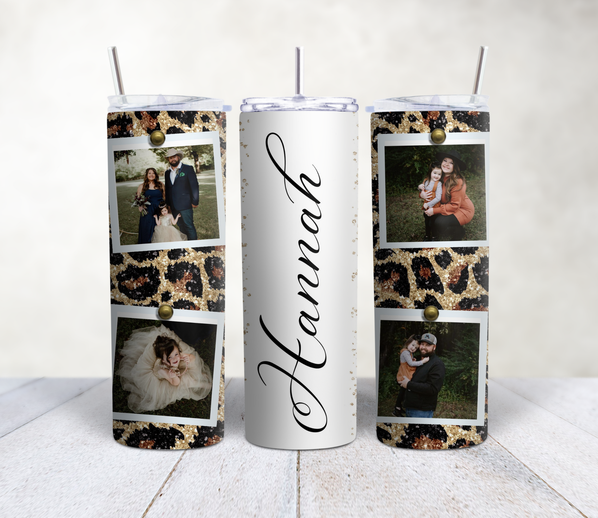 Glittery Animal Print 4 Photo Tumbler. This tumbler has spaces for 4 pictures. You will need to contact us via email to start the design process. The base rate for a tumbler is $25 for a 20oz and $30 for a 30oz. Inserting photos is an additional $1 per photo.