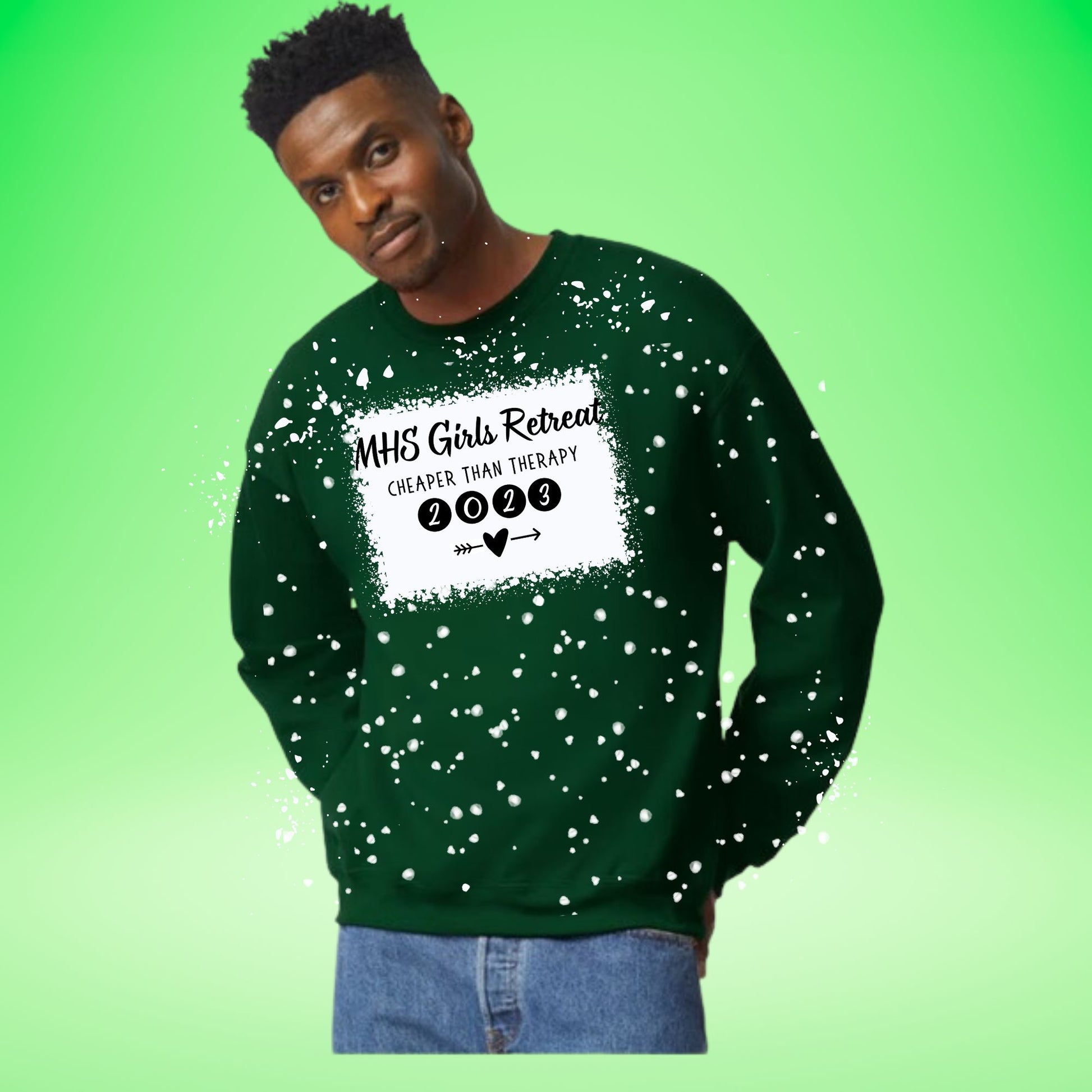 This is a mock up of the design, not the actual product. Due to the nature of the splatter bleach style, shirts are all unique. No two will be the same.