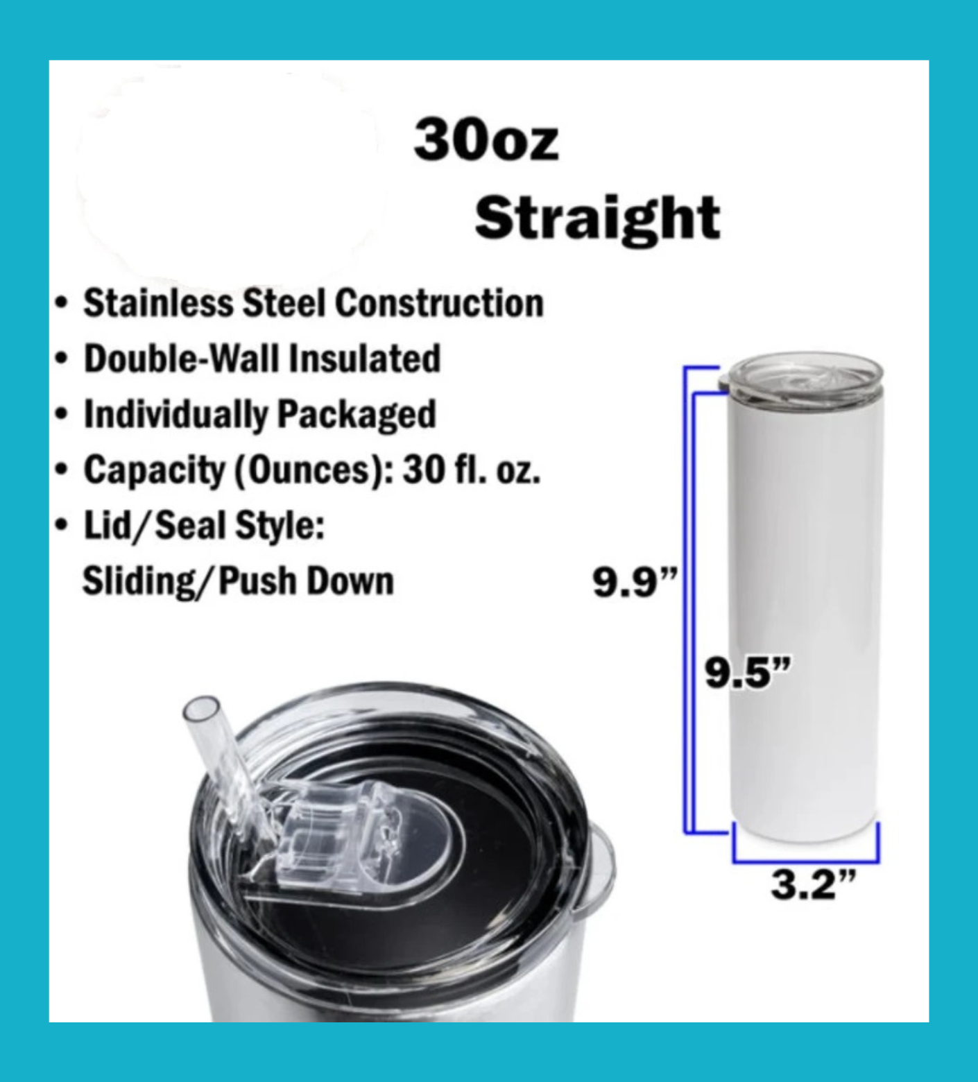 These are skinny tumblers offered in 20oz and 30oz sizes that fit perfectly in your hand. The 30oz will need a cup holder adapter. Customization is available.