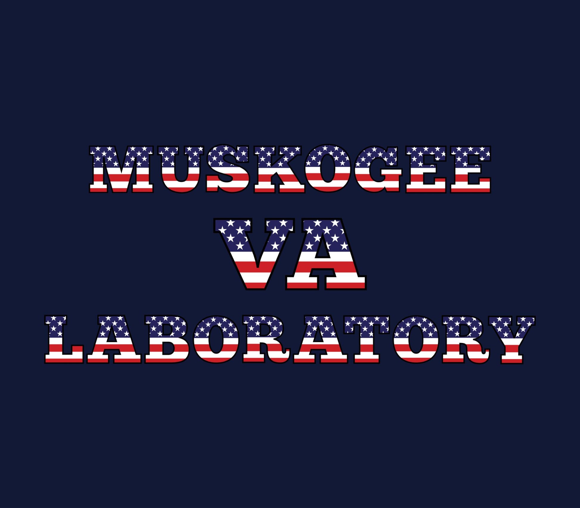 Stars & Stripes lettering on a navy colored tee. Silhouette of soldier surrounded by "SERVING AMERICA'S HEROES" on front left chest. "MUSKOGEE VA LAB" on the back. Pictures of the design are a mock up of the actual product. Transfer method is DTF.